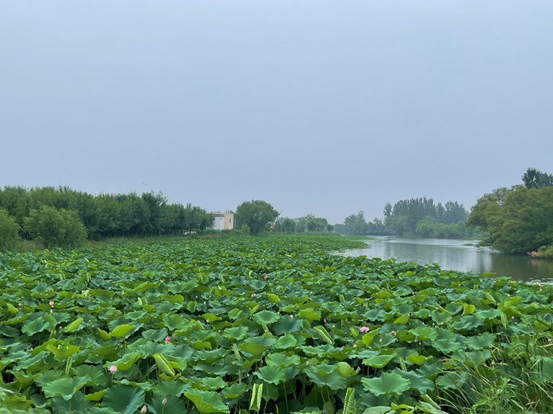 以荷花為主題,堤岸打造木棧道,河岸搭配蘆葦等植物,充分發(fā)揮綠地效益。